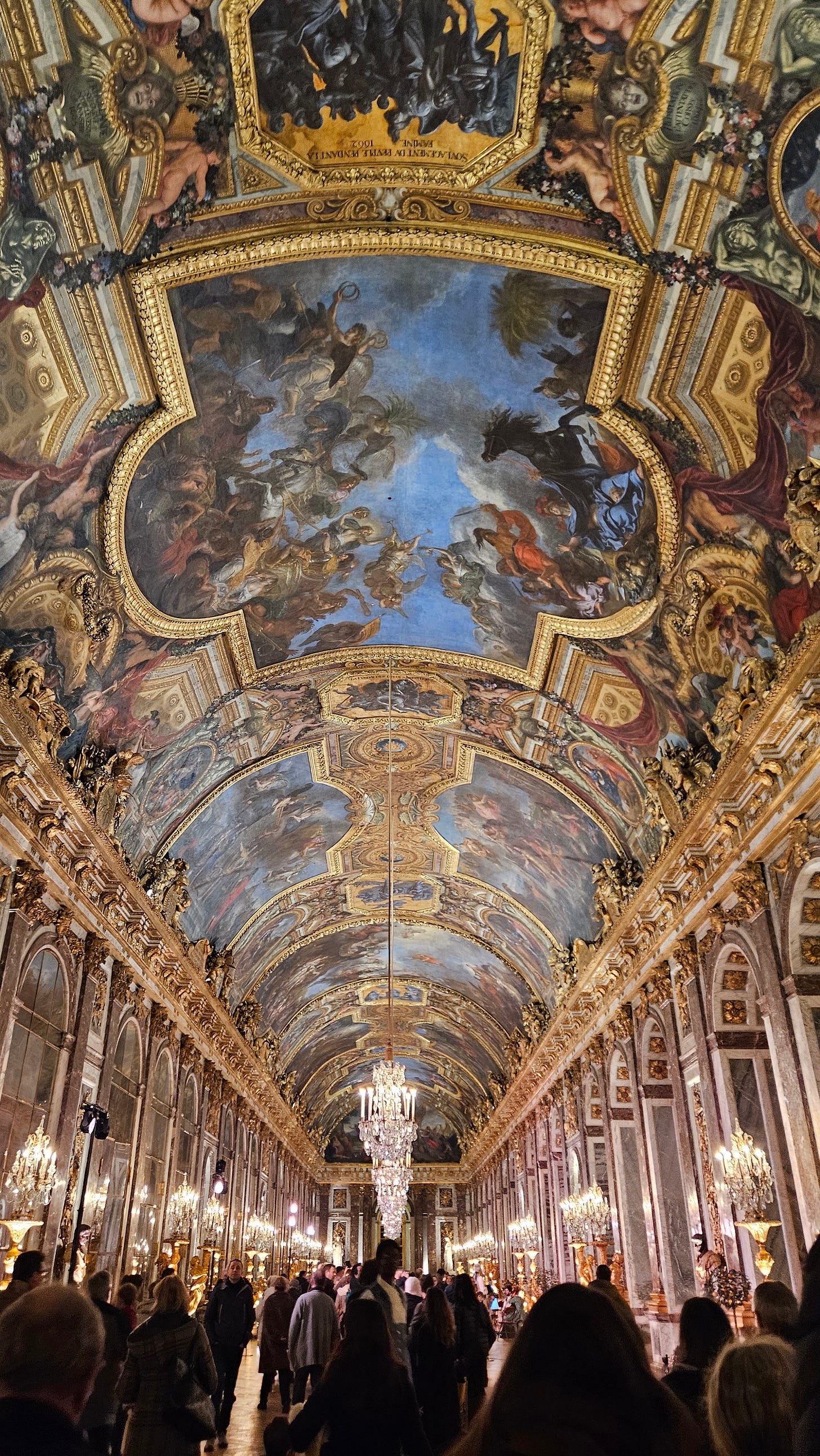 We wended our way through the rooms of Versailles, including the Hall of Mirrors below. As you can see, there weren’t too many people.
